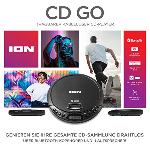 ION Audio CD GO – Tragbarer Retro CD-Player mit Kopfhörern und Bluetooth-Verbindung für Streaming an Bluetooth…