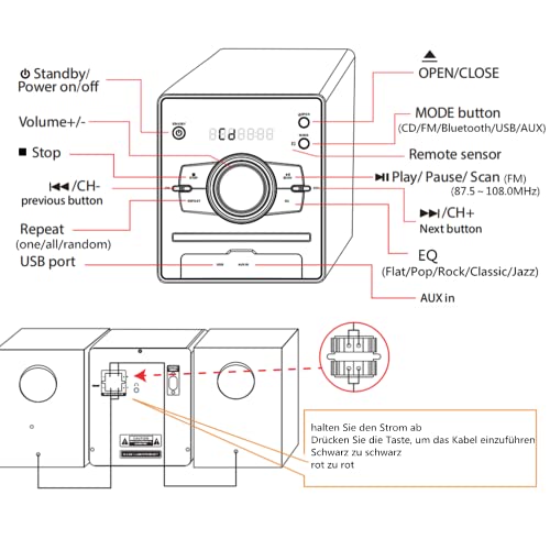[Multifunktion] ► 1. CD hören: CD/CD-R/CD-RW/MP3 ► 2. Radio hören: 87,5 MHz bis 108 MHz ► 3. Bluetooth verbinden: Verbinden Sie Ihr Gerät (Telefon, Computer usw.) mit den CD-Player (Bluetooth-Kopfhörer werden nicht unterstützt) ► 4. Hören Sie MP3s über USB (bis zu 64 GB): MP3/WMA ► 5. AUX IN: Verbinden Sie das Gerät (Telefon, Computer usw.) mit dem CD-Player ( stellen Sie sicher, dass das Gerät über eine 3,5-mm-Buchse verfügt) ►6. Hören Sie mit Kopfhörern
