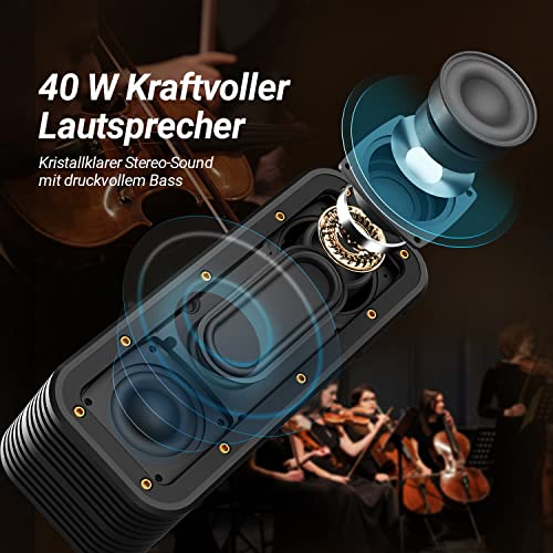【40W HD-Sound mit starkem Bass】BOGASING M4 Bluetooth Lautsprecher verwendet zwei Hochleistungstreiber und einen Bassstrahler, liefert tiefe Bässe und einen kraftvollen Sound mit 40 Watt für einen drahtlosen box. Die fortschrittliche DSP-Technologie gewährleistet eine genaue und klare Klangwiedergabe,ohne Verzerrung bei jeder Lautstärke.