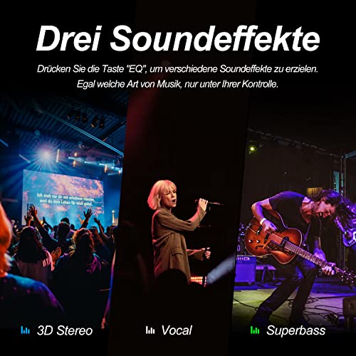 【Drei Soundeffekte】 Drücken Sie die “EQ”-Taste, So kann man nun zwischen Vokal、Super Bass oder 3d Stereo wählen. Alle Klänge aus de bluetooth Lautsprechers ind knackig, natürlich, realistisch und frei von Kratzern. Bogasing bluetooth equalizer soundbox bietet Ihnen mehr Hörvergnügen! !